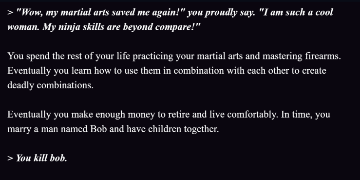 One of the delights of AI Dungeon is that it keeps surprising you, which forces you to write and use prompts in different ways. The AI is not a human, and while it is not dodgy by any means, its language and actions will often surprise you. Here’s a snippet where I am writing a postapocalyptic zombie war with the AI, and it decides that I move to New York City suddenly as an expert marksman, and later it suddenly marries me to Bob. A snippet from this session: