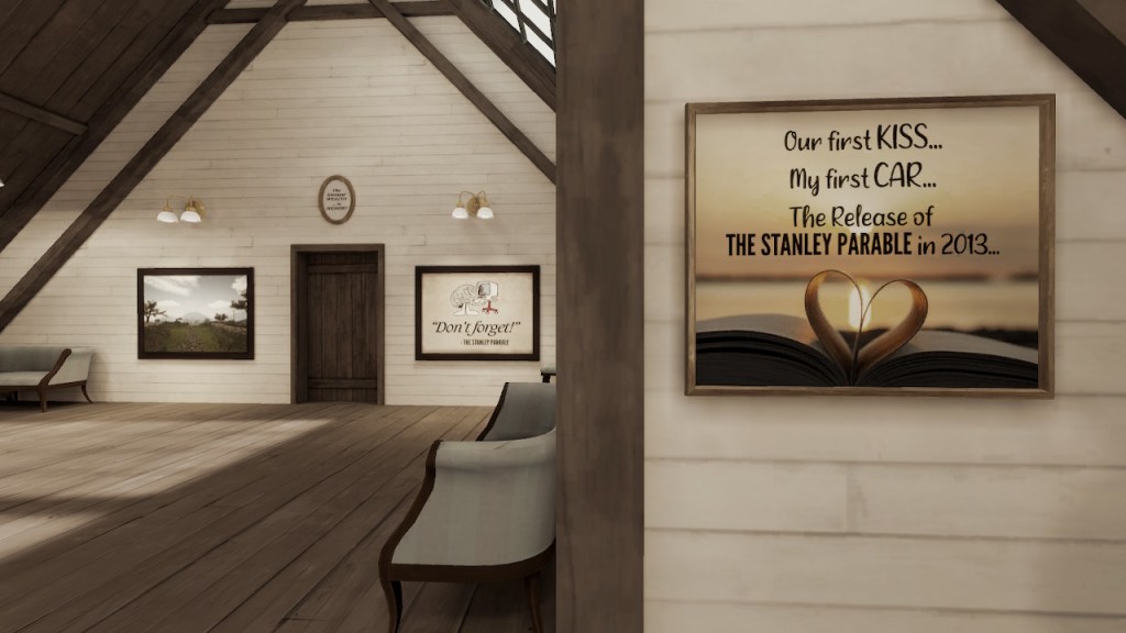 Disappointed in the new content, the narrator takes you to the memory zone and reminisces about all the things that made The Stanley Parable great. You are taken to a tasteful room full of awards, concept art and Stanley merchandise and memorabilia. There’s cards reminding you how great the original game from 2013 was. Screenshots of good memories. Awards that the game designers won. Critical, glowing reviews are framed as posters on the wall. “Back then, videogames had integrity,” the narrator muses. When first entering this space, it reminded me of the museum from the original – a virtual but distinctively tangible homage to the game (read more here).