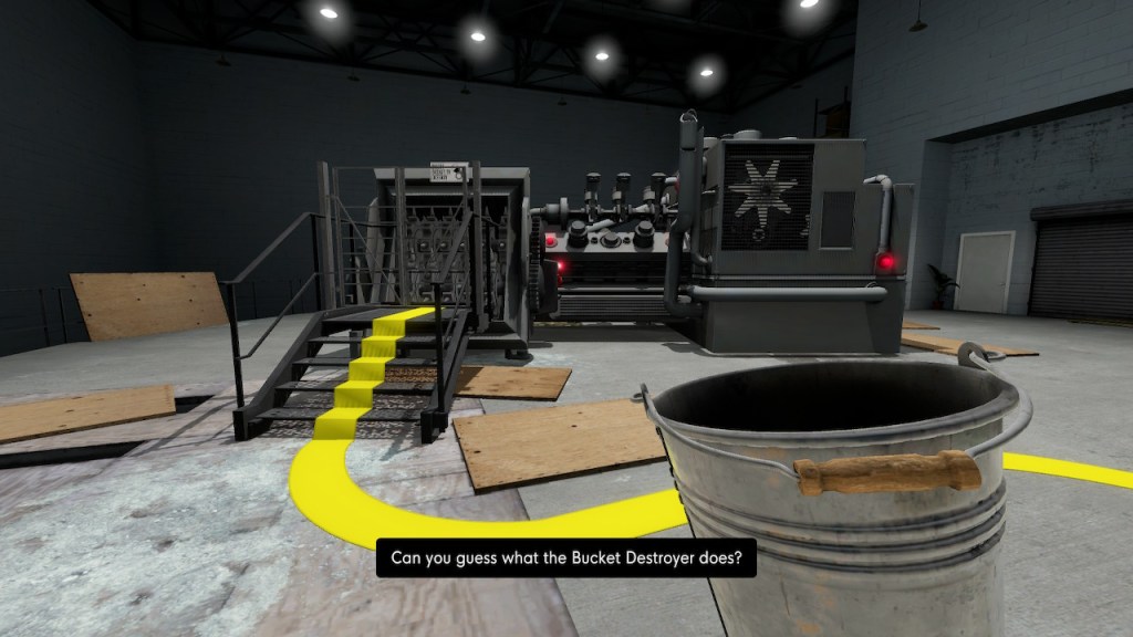 The bucket is perhaps best compared to Portal’s companion cube. It is an item and a prop. In some endings, the bucket is anthropomorphized heavily by the narrator, and becomes a companion character. The intertext with Portal and its beloved cube is quite explicit in the game. For instance, you are forced to destroy the bucket in a bucket destroying machine. This ending clearly riffs off the moment in Portal where GLaDOS forces you to burn the companion cube in an incinerator, before you can continue the game. (If you love it, you have to let it go.)