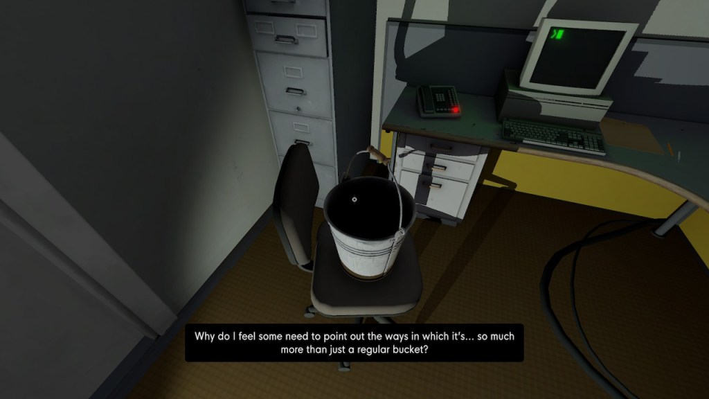 When I first read this statement about the new edition of The Stanley Parable, I was riddled. Turns out that it’s a great way of summarizing the game. The bucket completely warps the experience of The Stanley Parable. You are at once Stanley, as well as a new character, the bucket.