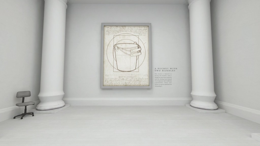 The bucket is reflected on as an artwork, then, which is further amplified in the new museum ending. This time, the museum features a bucket exhibition, showcasing different artworks with buckets. There’s historical artworks as well and even cave paintings centering around buckets. This ending rewrites history as one in which humans always used buckets as tools, and glorified buckets. The ending augments the idea that in-game objects are art and design. And as in the original ending, the female narrator / critic does a great job guiding you through the museum, and explaining the significance of buckets.