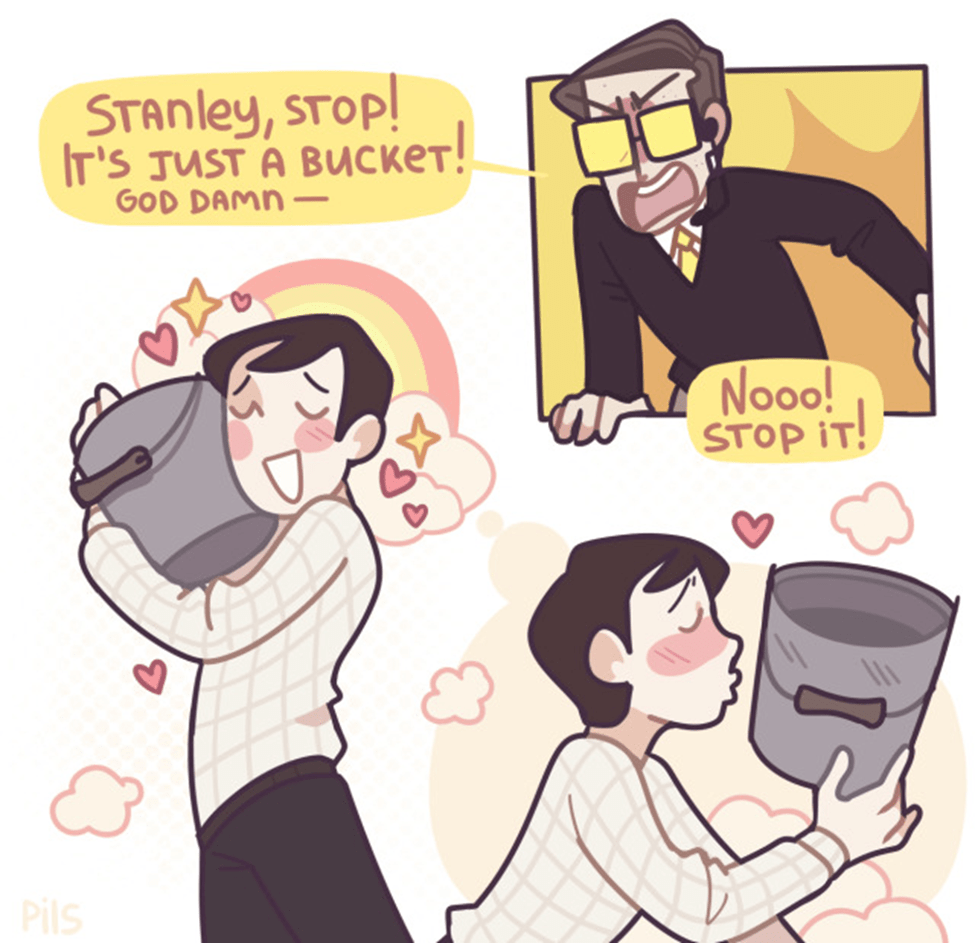 The idea that the bucket is a meaningful, grounding item is explored throughout the game. In one ending, Stanley loses his bucket, and goes insane without its presence. He is haunted by other buckets. He keeps looking as he goes through the basement of the office, taunted by the narrator: “None of them were his. None of them were his special bucket.” The bucket is an important possession then. At any time in the game when you go into the broom closet, and try to store the bucket, the narrator insists that Stanley should keep the bucket. It belongs to him. You are even given stickers as proof of ownership of the bucket (Property of: Stanley).